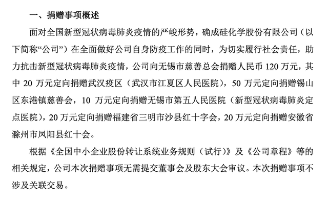 確成硅化表示,本次對(duì)外捐贈(zèng)資金來源于公司自有資金,對(duì)公司當(dāng)期及未來經(jīng)營業(yè)績不構(gòu)成重大影響,亦不會(huì)損害公司和投資者的利益。公司將全力以赴做好防疫工作,保障員工安全、保障生產(chǎn)經(jīng)營。